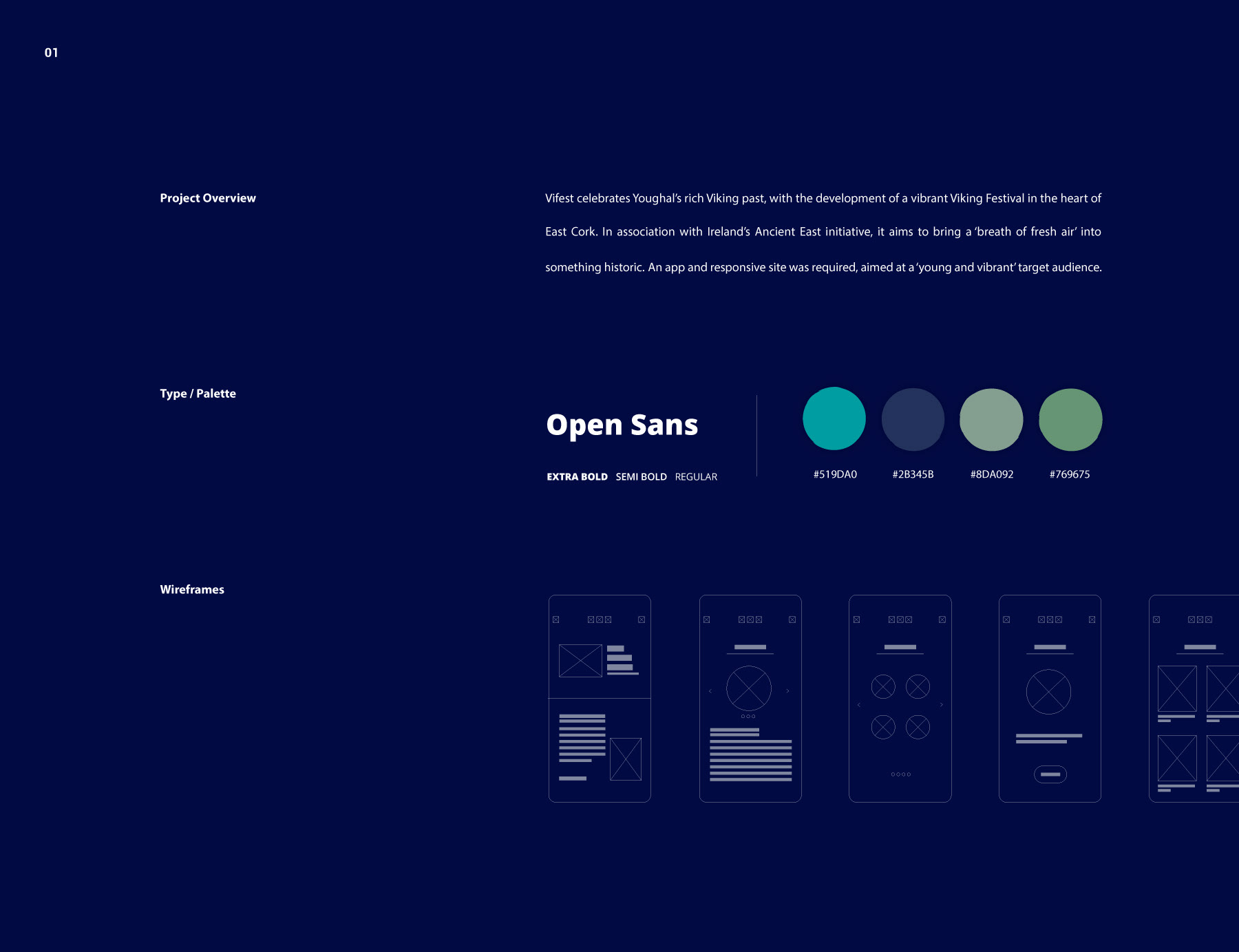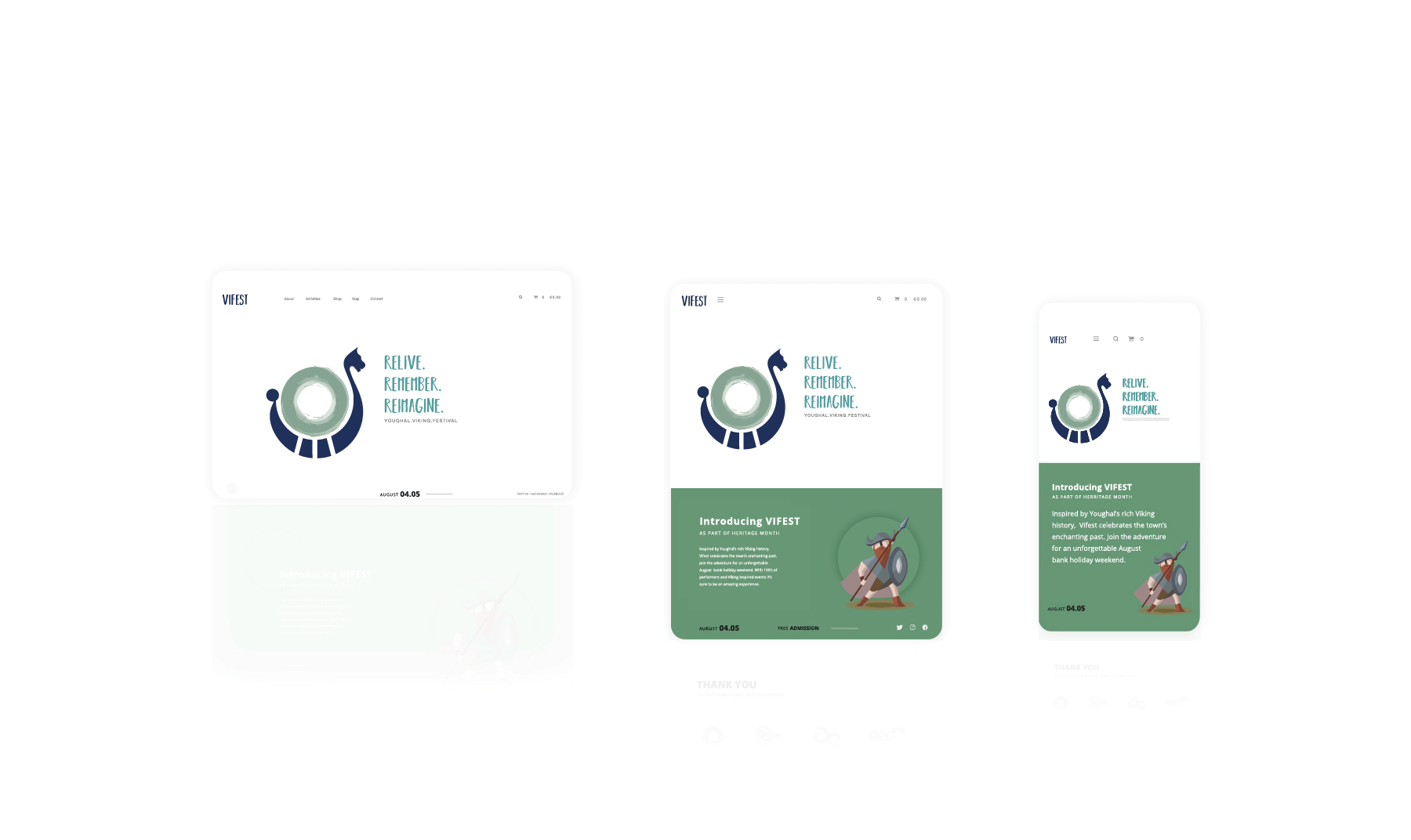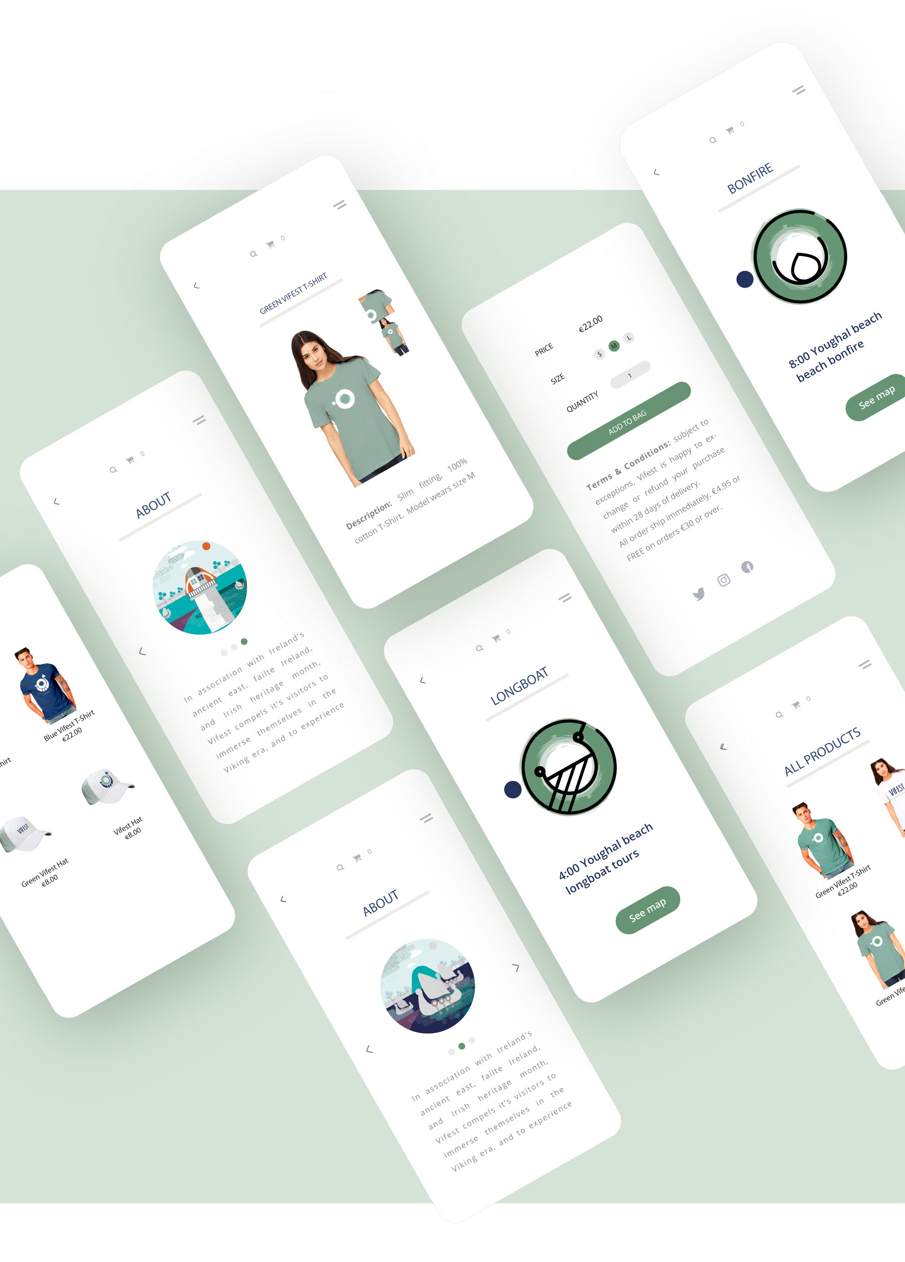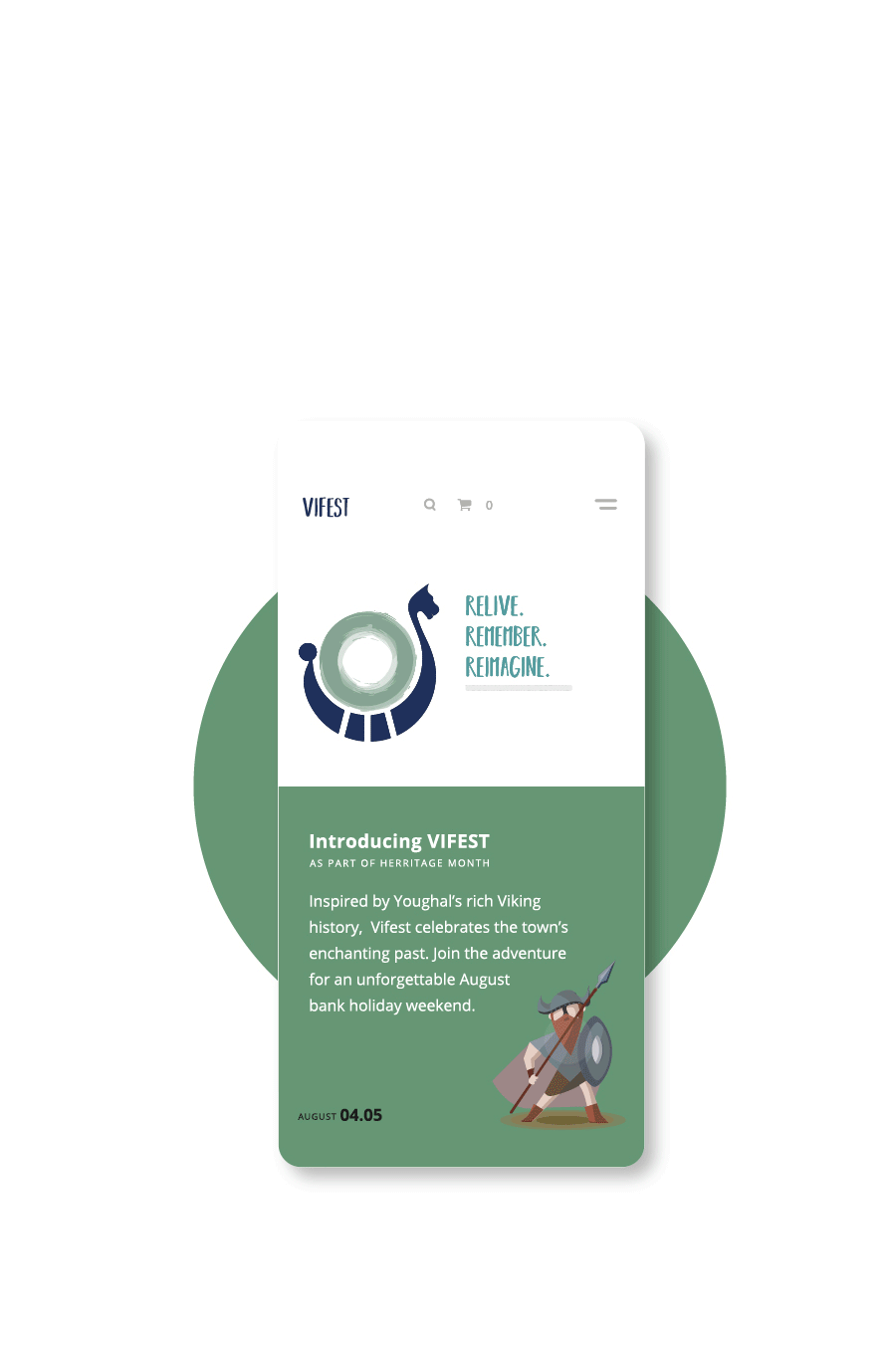 Vifest celebrates Youghal's rich Viking past, with the development of a vibrant Viking festival in the heart of East Cork. In association with Ireland's Ancient East initiative, it aims to bring a 'breath of fresh air' into something historic. An app and responsive site was required, aimed at a 'young and vibrant' target audience. The app shown is a conceptual mockup, illustrating the intended experience.